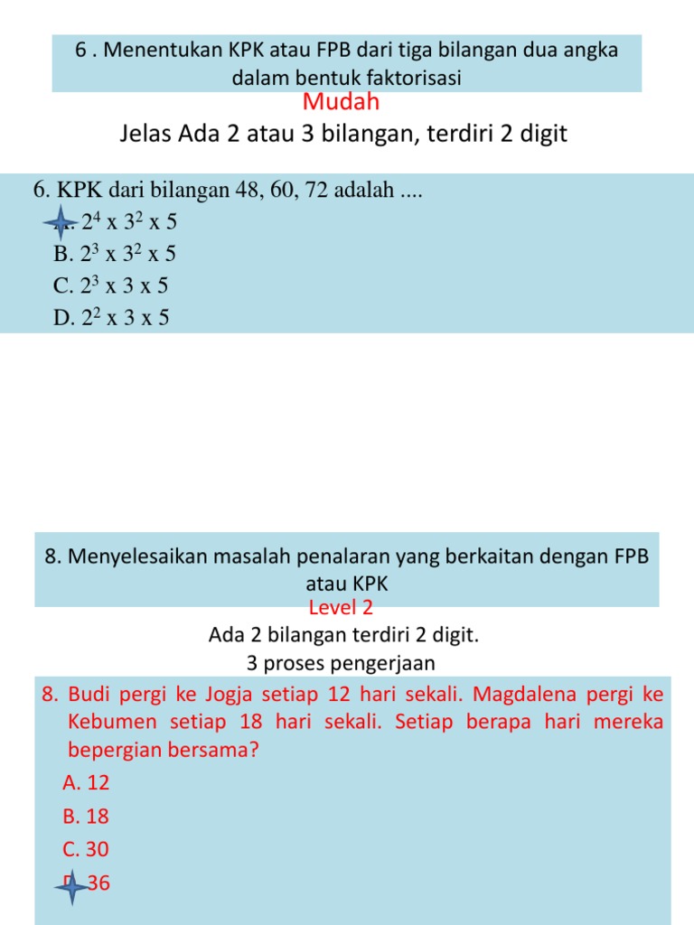 Faktor prima, faktorisasi prima, kpk dan fpb kelas v semester i kurikulum evaluasi profil referensi materi silakan anda ganti judul utama, kelas dan semesternya dengan cara mengklik dua kali pada. Ujian semester 1 matematika sd mi kelas 6. Cara menentukan kpk dan fpb dengan faktorisasi primaподробнее. Menentukan kpk kelipatan persekutuan terkecil atau kpk dari beberapa bilangan dapat ditentukan dengan faktorisasi prima. Caranya, cari dulu faktorisasinya dari bentuk aljabar itu menggunakan pohon faktor untuk angkanya.