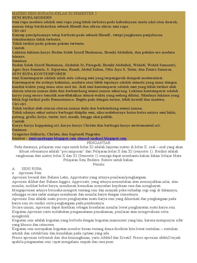 Dec 15, 2017 · buku seni budaya kelas 11 kurikulum 2013 revisi 2017 pdf ini merupakan buku edisi terbaru untuk digunakan sebagai penunjang pada pembelajaran mapel seni budaya jenjang sma/ma/smk kelas xi yang diharapkan lebih sesuai. Dec 08, 2020 · materi seni budaya kelas 11 semester 2 k13. Seni rupa pramodern istilah seni rupa pramodern menunjukkan babakan sejarah di mana manifestasi karya seni rupa hadir sebelum zaman industri. Download buku seni budaya (semester 2) kelas 11 sma. Pembelajaran seni budaya untuk pendidikan menengah kelas xi adalah salah satu usaha untuk melestarikan peradaban bangsa melalui pemahaman terhadap sejumlah karya seni budaya bangsa dari berbagai penjuru nusantara yang sangat kaya ragam dan sarat makna.